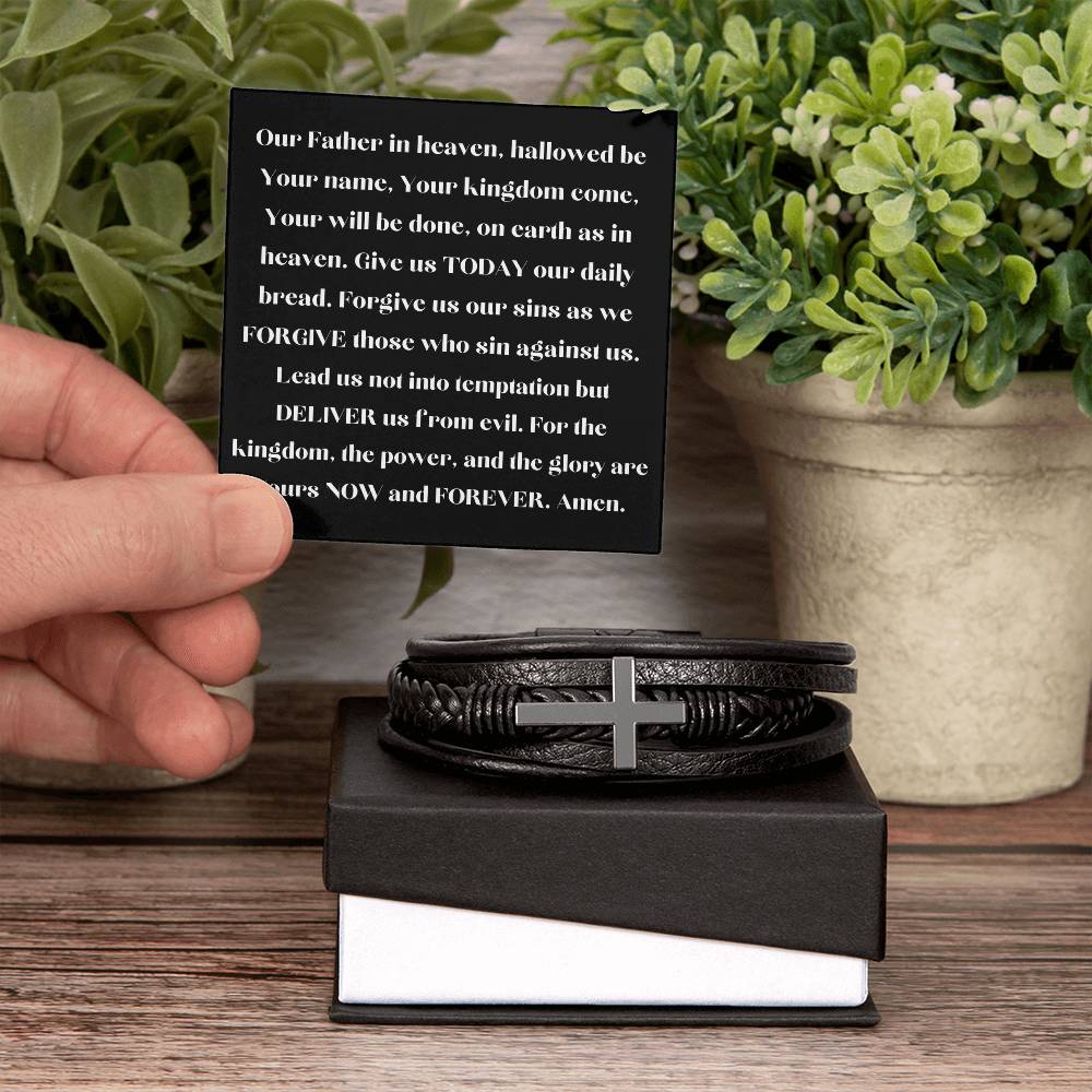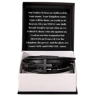 Embrace your faith with our Lord's Prayer Men's Leather Bracelet, a striking piece that combines style, strength, and spirituality. This meticulously crafted bracelet features a durable black leather band and a sleek stainless steel cross at its center, making it a timeless accessory for any occasion.