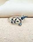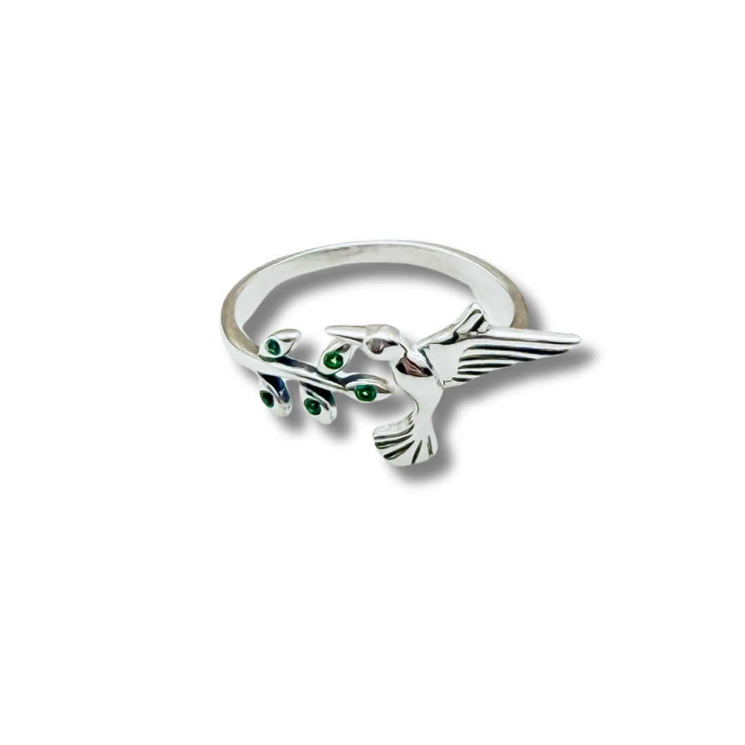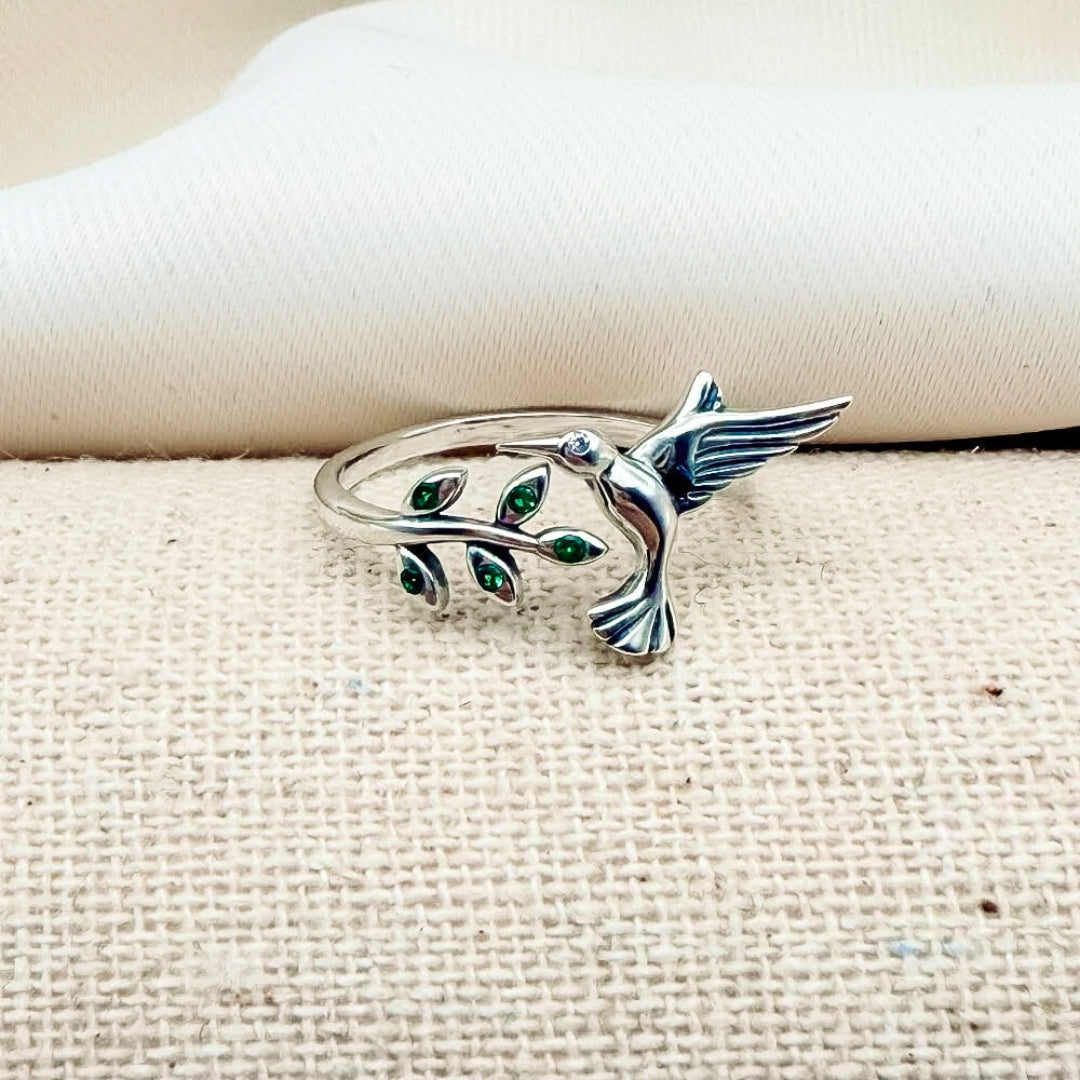 Celebrate the grace and resilience of nature with our Nature's Grace Hummingbird Ring, a symbol of joy and determination. Made from high-quality .925 sterling silver, this adjustable ring features a stunning hummingbird with a branch detail adorned with green pavé Cubic Zirconia stones, adding a touch of refined sparkle. The ring's design embodies the beauty and lively spirit of the hummingbird, known for its inspiring symbolism of overcoming challenges and finding happiness in the moment.
